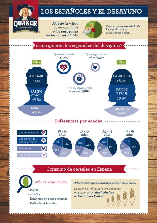 Son datos de un estudio sobre hábitos de consumo desarrollado por Quaker, la marca de referencia en avena. Según este informe, el consumo de avena se ha duplicado en los últimos 5 años siendo el desayuno el momento del día favorito para su ingesta. Entre los principales consumidores de avena, predominan las mujeres, de unos 40 años, residentes en zonas urbanas y con un estilo de vida activo.